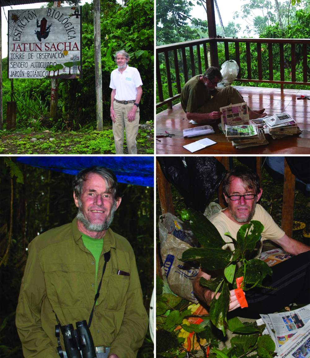 Clock-wise from top left: David at the Jatun Sacha Reserve in 2023. Pressing plants at the field station of Reserva Canandé, Ecuadorian Chocó in 2018, photo Bente Klitgaard. Pressing plants, Cordillera del Cóndor, 2014. David in the Cordillera del Cóndor, 2016. Except when mentioned, all photos by John Clark.