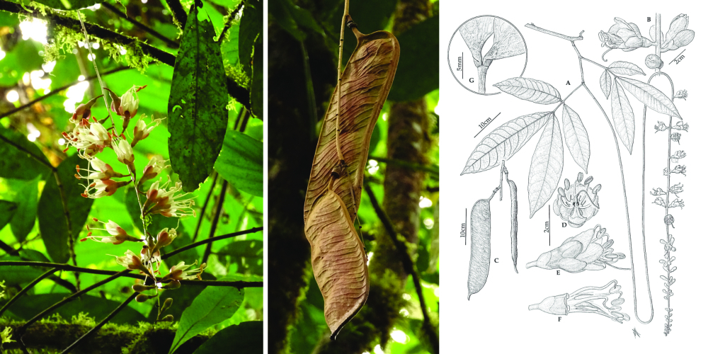 The monospecific legume genus Ecuadendron, described by David Neill in 1998, is a 30 m tall canopy tree, endemic to the Chocó rain forests of Ecuador, with long pendulous inflorescences of resupinate flowers with a rose to brick-red-coloured calyx and cream corolla, traits likely connected to bat pollination. Photos taken in the Reserva Canandé by Francisco Sornoza, Fundación Jocotoco; see also Lozano, P., Klitgaard, B., Neill, D. and Roa, L. 2022. Endemic Plants of Canandé Reserve. Field Museum field guides 1453. Drawing: John Myers.
