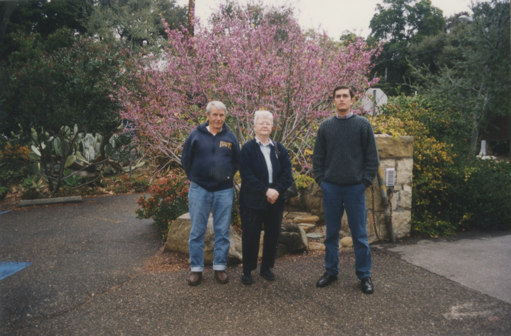 Shirley between Ken, to the left, and me (Vidal Mansano), to the right, at the Santa Barbara Museum of Natural History with a flowering Cercis tree behind us. “In 2001 during my PhD I went to Santa Barbara for two months to work with Shirley Tucker and study the floral development of some atypical Papilionoideae flowers. My first experience overseas. It was one of the most significant scientific happenings of my entire career!”